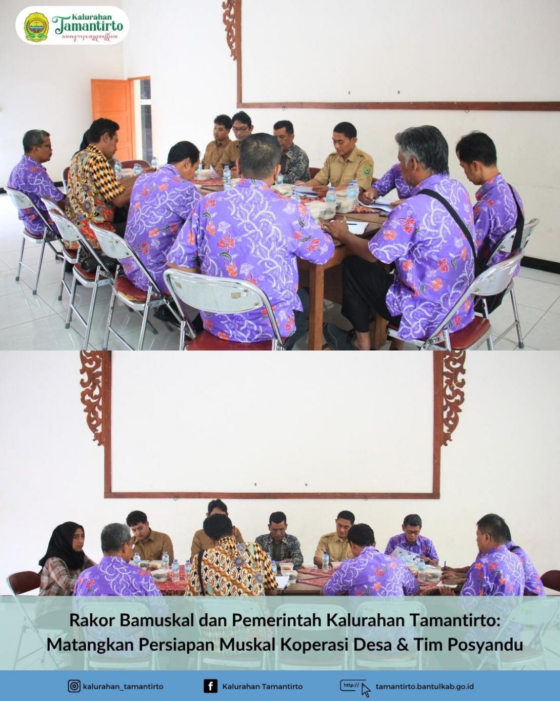 Tamantirto SID--Pada hari Senin, 26 Mei 2025 pukul 13.00 WIB hingga selesai, telah dilaksanakan Rapat Koordinasi antara Badan Permusyawaratan Kalurahan (Bamuskal) dan Pemerintah Kalurahan Tamantirto yang bertempat di Aula Kalurahan Tamantirto. Rapat ini digelar sebagai upaya untuk mempersiapkan Musyawarah Kalurahan (Muskal) dalam rangka pembentukan Koperasi Desa Merah Putih Tahun 2025 serta pembentukan Tim Posyandu di Kalurahan Tamantirto.