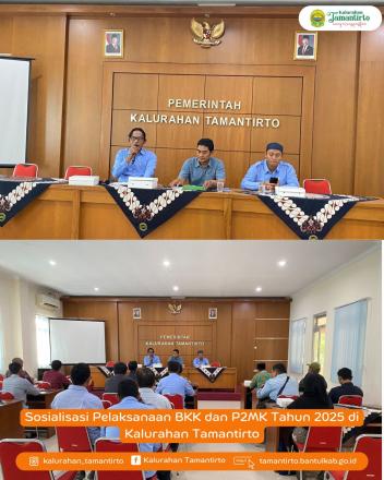 Tamantirto SID--Pada hari Selasa, 30 September 2025, bertempat di Ruang Rapat Taman Kasih lantai 2 Balai Kalurahan Tamantirto, diselenggarakan kegiatan sosialisasi pelaksanaan Bantuan Keuangan Khusus (BKK) dan Program Pemberdayaan Masyarakat Kalurahan (P2MK) Tahun Anggaran 2025. Acara ini dimulai pukul 10.00 WIB dan berlangsung hingga selesai.