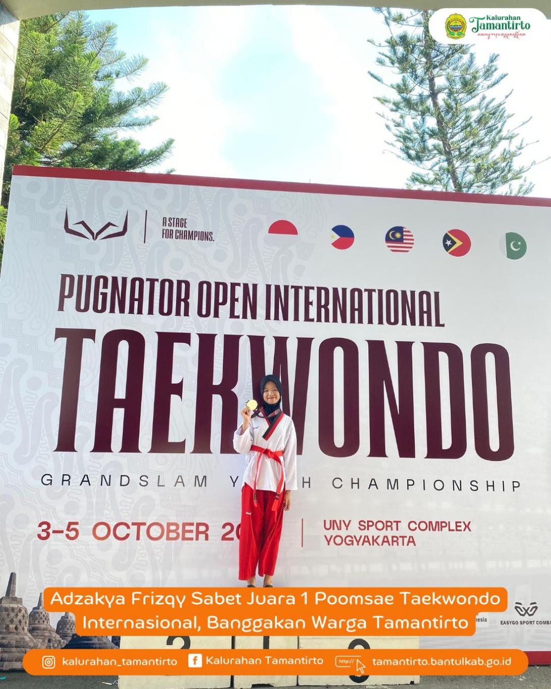 Tamantirto SID--Prestasi gemilang kembali datang dari warga Tamantirto. Adzakya Frizqy, warga Kasihan RT 07, Tamantirto, berhasil meraih Juara 1 kategori Poomsae dalam ajang bergengsi Pugnator Yogyakarta Taekwondo International Championship 2025. Kejuaraan tersebut digelar pada 3-5 Oktober 2025, di GOR Universitas Negeri Yogyakarta, Daerah Istimewa Yogyakarta (DIY).