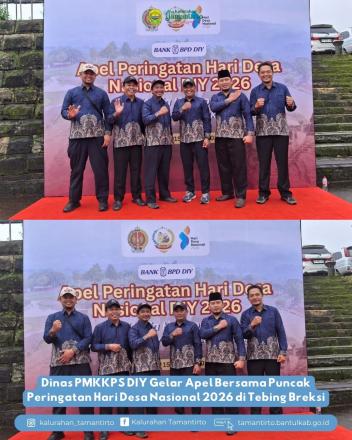 Tamantirto SID--Dalam rangka puncak Peringatan Hari Desa Nasional Tahun 2026, Dinas Pemberdayaan Masyarakat, Kalurahan, Kependudukan dan Pencatatan Sipil (PMKKPS) Daerah Istimewa Yogyakarta akan melaksanakan Apel Bersama pada Kamis, 15 Januari 2026. Kegiatan ini dijadwalkan berlangsung mulai pukul 07.30 WIB dan bertempat di Tebing Breksi, Kalurahan Sambirejo, Kapanewon Prambanan, Kabupaten Sleman.