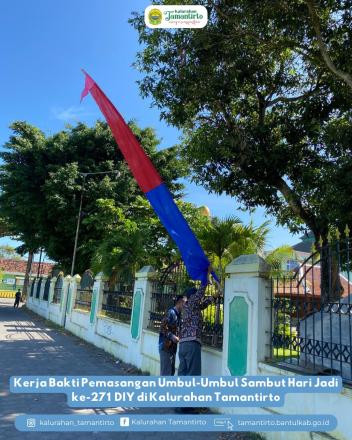 Tamantirto SID--Dalam rangka menyambut Hari Jadi ke-271 Daerah Istimewa Yogyakarta Tahun 2026, perangkat Kalurahan Tamantirto melaksanakan kegiatan kerja bakti pemasangan umbul-umbul pada Kamis, 12 Maret 2026, di halaman Kalurahan Tamantirto. Kegiatan ini dilakukan sebagai bentuk partisipasi dan semangat kebersamaan dalam memeriahkan peringatan hari jadi DIY.