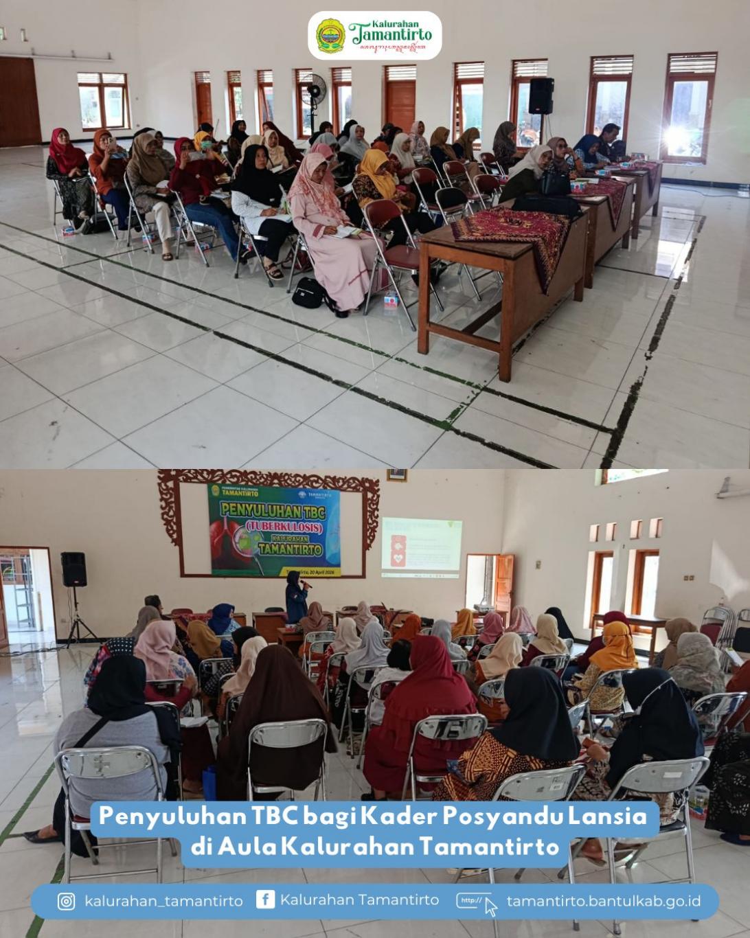 Tamantirto SID--Senin, 20 April 2026, telah dilaksanakan kegiatan Penyuluhan Tuberkulosis (TBC) bagi peserta kader Posyandu Lansia bertempat di Aula Kalurahan Tamantirto. Kegiatan ini menghadirkan narasumber dari LKC Dhuafa yang memberikan edukasi mengenai pengenalan penyakit TBC, cara penularan, pencegahan, pentingnya deteksi dini, serta pendampingan pengobatan bagi penderita TBC.