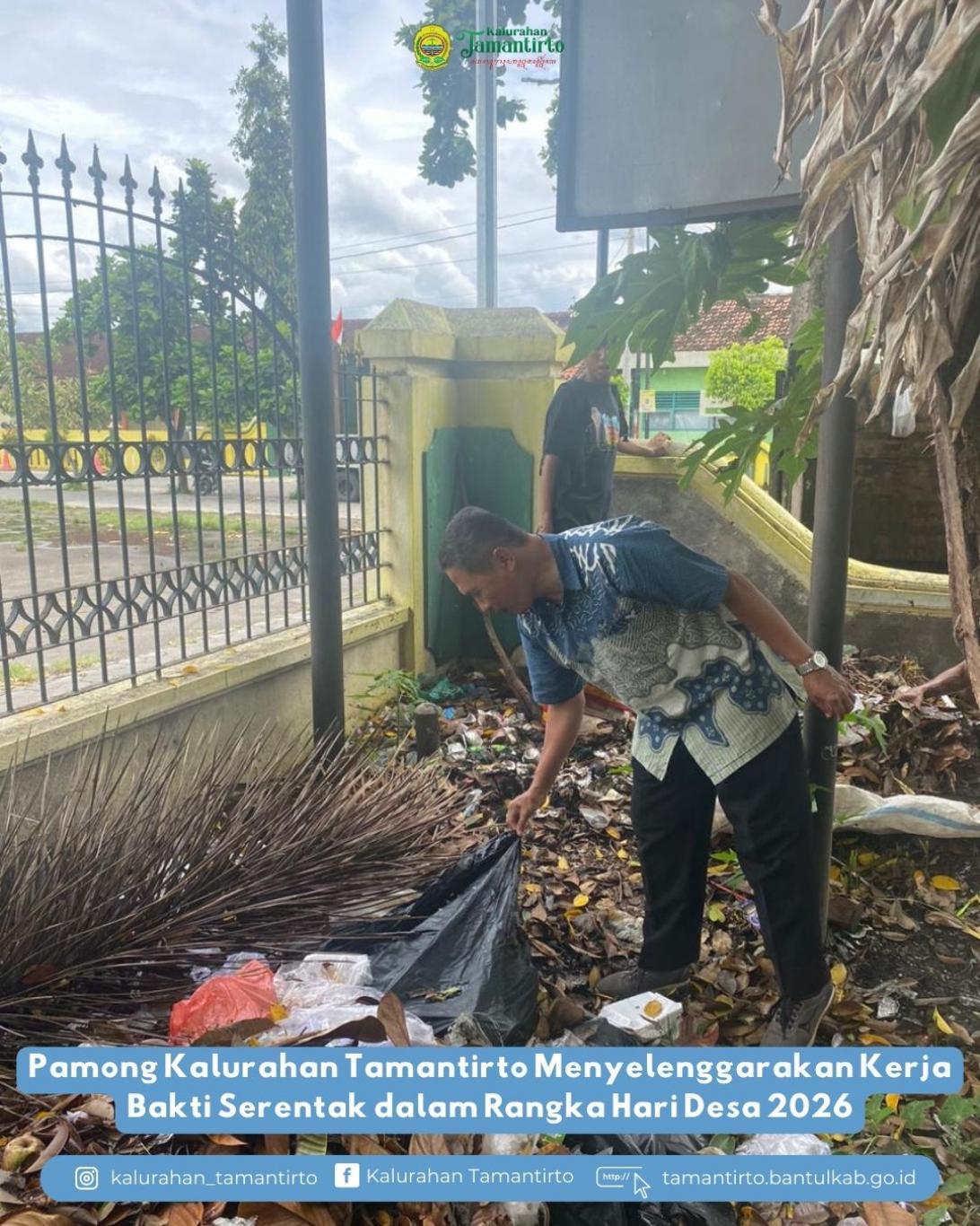 Tamantirto SID--Pamong Kalurahan Tamantirto menyelenggarakan kegiatan kerja bakti sebagai bagian dari pelaksanaan Peringatan Hari Desa Nasional Tahun 2026. Kegiatan ini dilaksanakan secara serentak pada hari Kamis, 15 Januari 2026, sebagai tindak lanjut hasil Rapat Koordinasi Persiapan Peringatan Hari Desa DIY Tahun 2026.