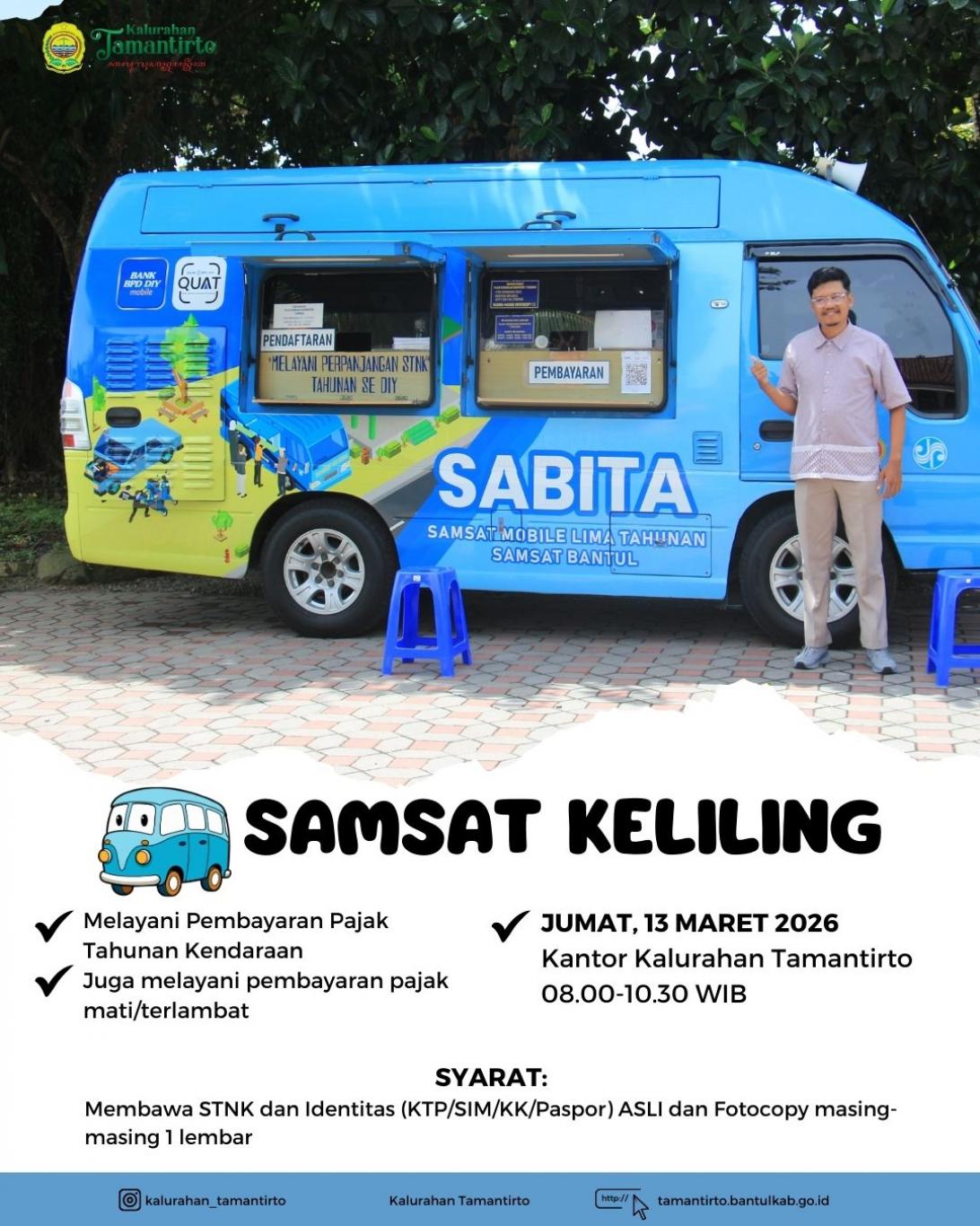 22 Agustus 2025 14:06:33 WIB AdministratorJumat, 29 Agustus 2025Kantor Kalurahan Tamantirto08.00-11.00 WIBSyarat:Membawa STNK dan Identitas (KTP/SIM/KK/Paspor) Asli dan FC masing-masing 1 lembarMelayani pembayaran pajak tahunan kendaraan juga melayani pembayaran pajak mati/terlambat... ..selengkapnya