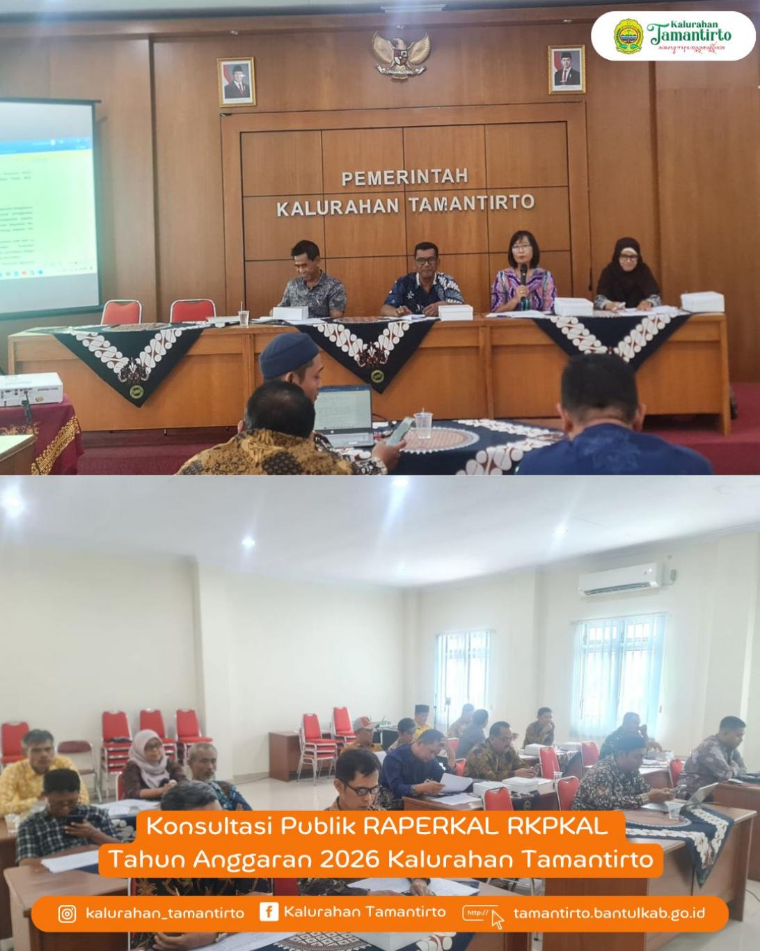 Tamantirto SID--Kalurahan Tamantirto menggelar Konsultasi Publik Rancangan Peraturan Kalurahan (RAPERKAL) Rencana Kerja Pemerintah Kalurahan (RKPKAL) Tahun Anggaran 2026 pada Kamis, 13 November 2025. Acara berlangsung di Ruang Rapat Lantai 2 mulai pukul 13.00 WIB hingga selesai, dengan dihadiri oleh berbagai unsur pemerintahan kalurahan dan perwakilan masyarakat.